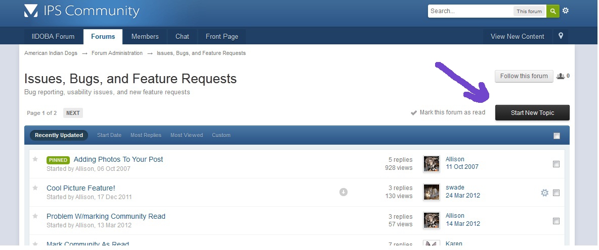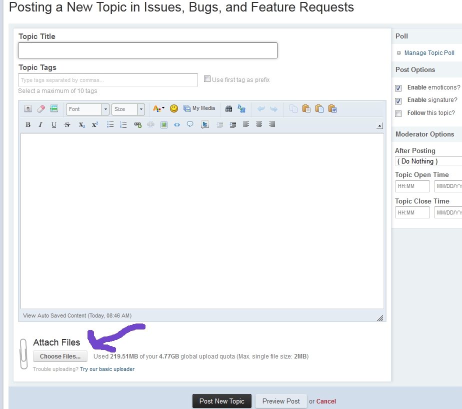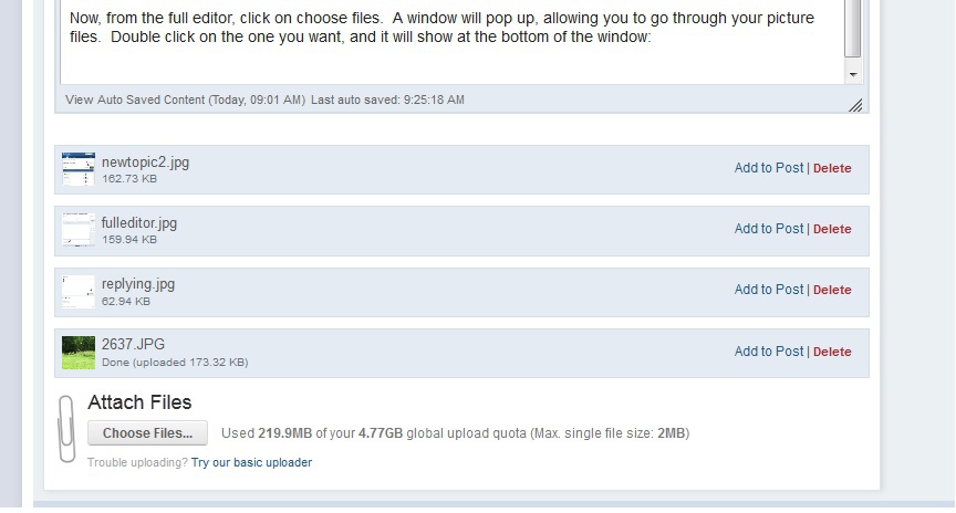 Allison 2,369 Posted June 22, 2012 Report Share Posted June 22, 2012 This is a tutorial on how to add photos to your post. 1. you need to have the full editor open to add a photo. If you start a new topic, the full editor opens automatically. To start a new topic: Starting a new topic will give you the full editor window, which looks like this: The arrow points to the "choose files" button which allows you to browse through your photos. When starting a new topic, you must add a title. The forum will prompt you, if you forget. To reply to a post and add a photo: When replying to a post, you get a condensed version of the editor, This saves time and space. If you want to add a photo, or some special bits, you will have to switch to the full editor by clicking on "More Reply Options", which will bring you back to the full editor: Now, from the full editor, click on choose files. A window will pop up, allowing you to go through your picture files. Double click on the one you want, and it will show at the bottom of the window: In this last photo, you can see 4 of the photos I am using in this tutorial. So now they are on your editing window. You can chose to put them together, or space words between them, as I did here in this tutorial. When you are ready to add your photo, put your cursor where you want it and click on "Add to Post". I will say a few words here, and now add my photo of my excellent frisbee dog: Note: You can attach all your pictures, and then write your post adding them in where you want. Or choose your photos, adding them as you go. Quote Link to post Share on other sites